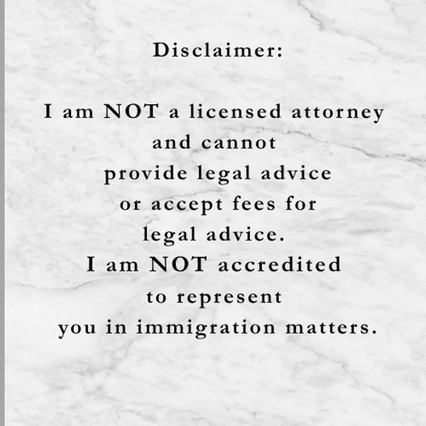 Disclaimer: I am NOT a licensed attorney and cannot provide legal advice or accept fees for legal advice. I am NOT accredited to represent you in immigration OR any other matters.
